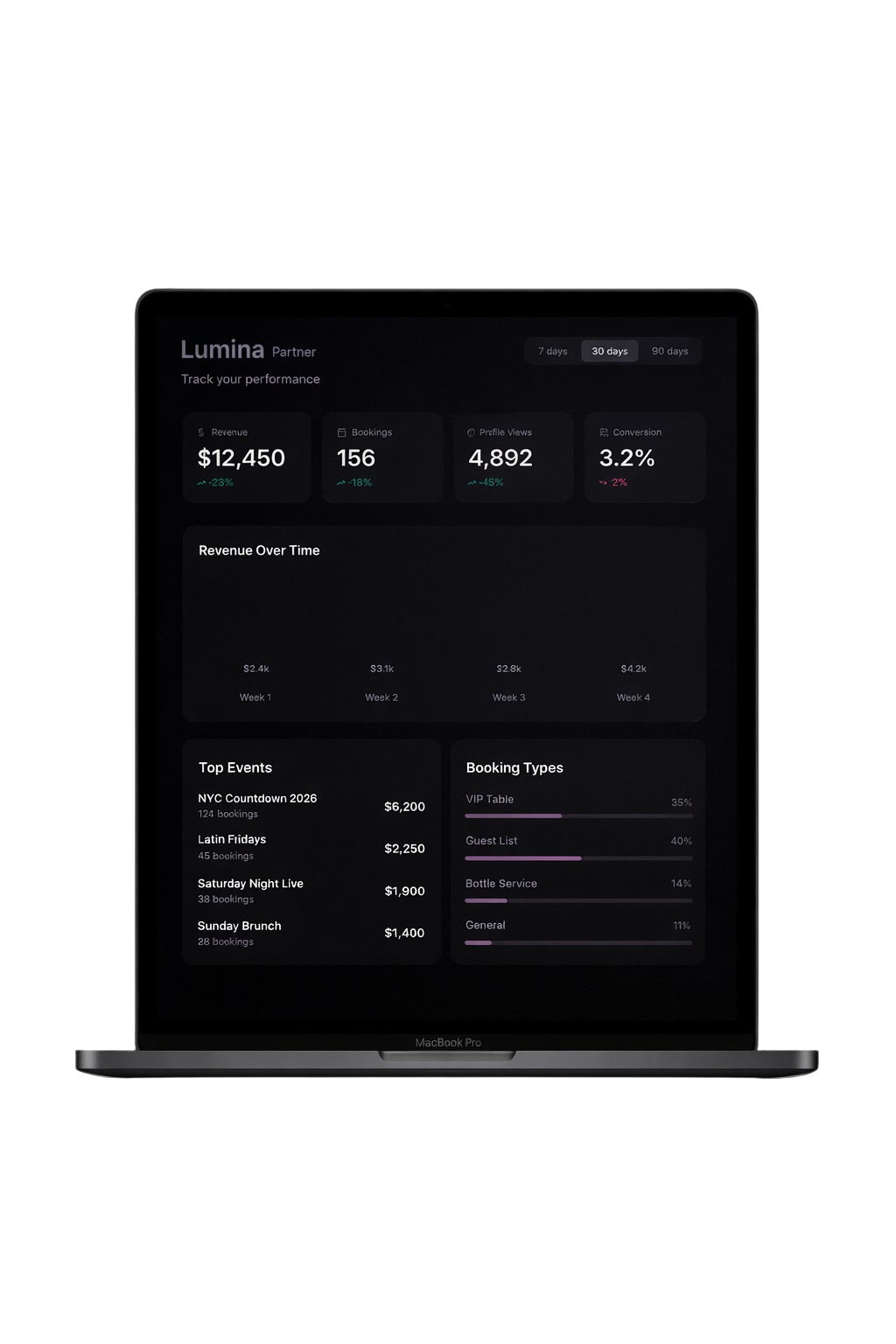Build your brand, manage guest lists, and get paid for every booking. Track your performance across multiple venues.